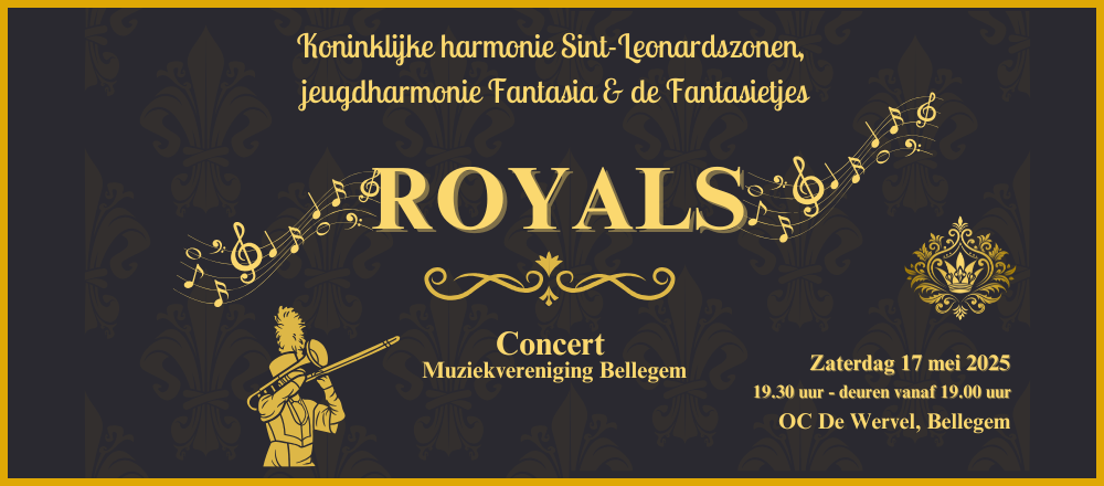 Muziekvereniging Bellegem nodigt je uit voor een avond rijkelijk gevuld met muziek! Onze drie orkesten – de Fantasietjes, Fantasia en de Sint-Leonardszonen – brengen je een majestueus concert met als thema Royalty.